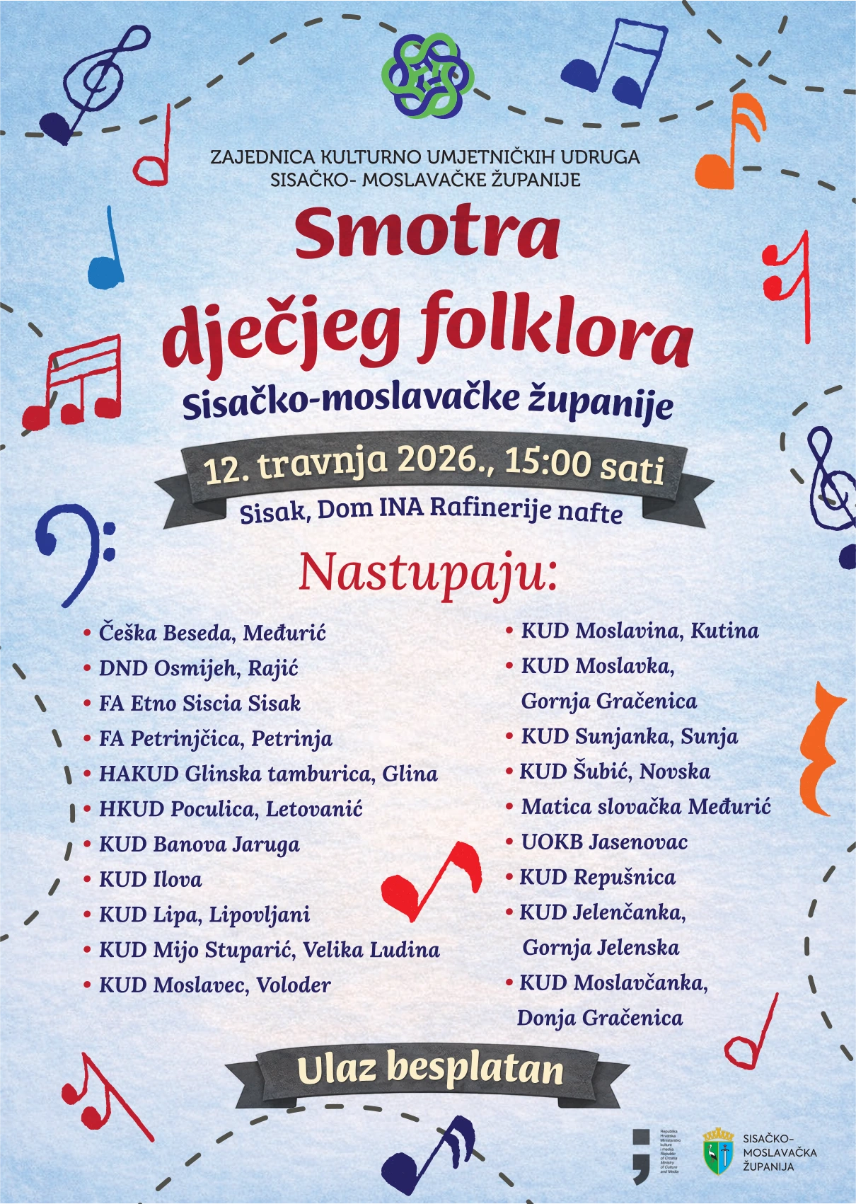 Zajednica kulturno umjetničkih udruga Sisačko moslavačke županije, u suradnji s KUD-om „Šubić“ Novska i Hrvatskim saborom kulture, a uz financijsku potporu Ministarstva kulture...