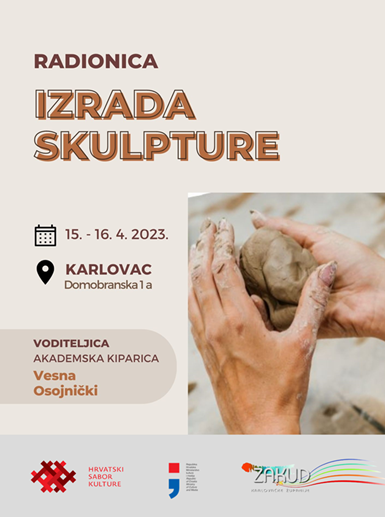 Hrvatski sabor kulture poziva vas na likovno-kiparsku radionicu „IZRADA SKULPTURE“ koja će biti održana 15. i 16. travnja 2023. u Karlovcu pod vodstvom akademske kiparice mr. art. Vesne Osojnički.